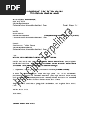 Format Surat Rasmi Kurangkan Kadar Saman Pdf